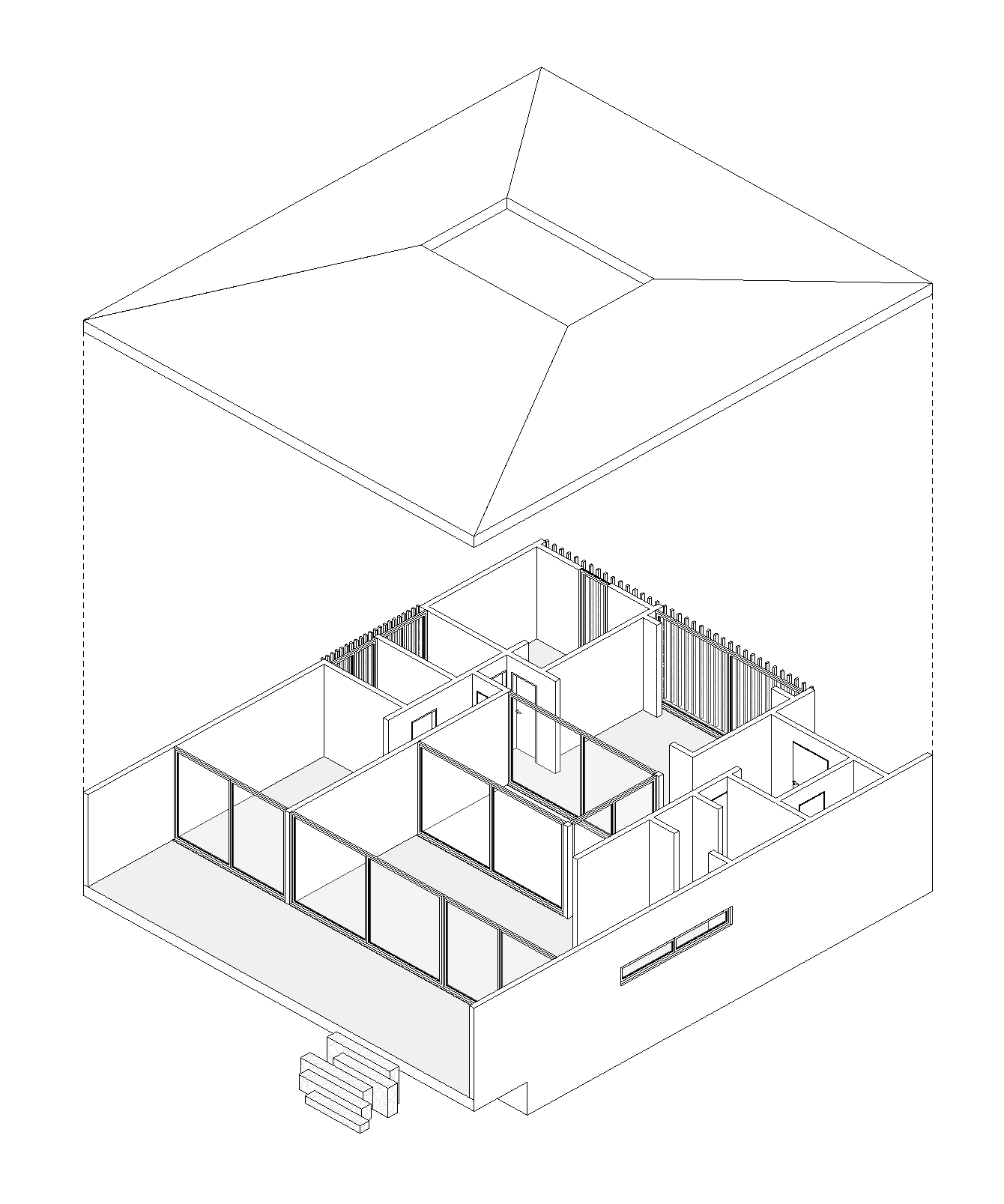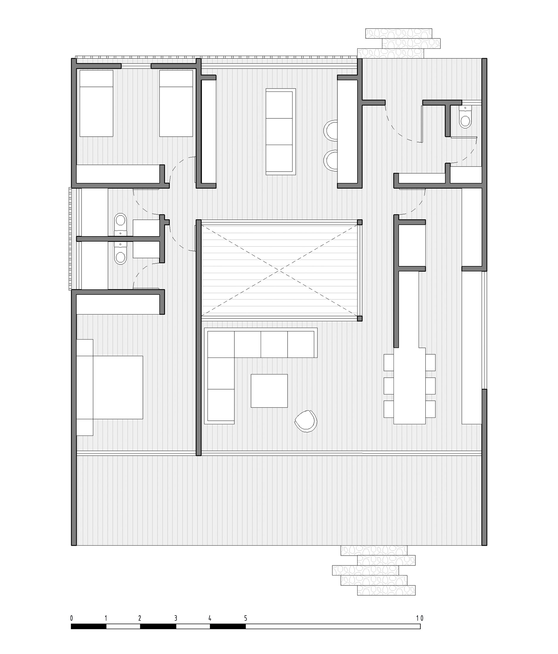 En torno a esta terraza se desarrolla una circulación en forma de U que ordena el programa en un solo nivel: zonas privadas hacia el nororiente y surponiente, y áreas comunes —living, comedor y cocina— orientadas al norponiente para capturar la vista y extenderse hacia una gran terraza frontal suspendida sobre el terreno. El volumen, compacto y elevado sobre cimientos de hormigón visto, se apoya mínimamente en la ladera gracias a una estructura íntegramente en madera y una cubierta a cuatro aguas de baja pendiente que se integra silenciosamente al perfil del lugar, dentro de una lógica precisa de construcción. La planta libre de los espacios comunes y la reducida presencia de elementos estructurales visibles refuerzan la claridad formal del proyecto, privilegiando amplitud interior, continuidad exterior-interior y una relación directa y permanente con el paisaje costero. La selección de materiales de construcción responde a criterios de durabilidad frente a la exposición marina, consolidando una arquitectura coherente con su entorno y sistema de construcción.