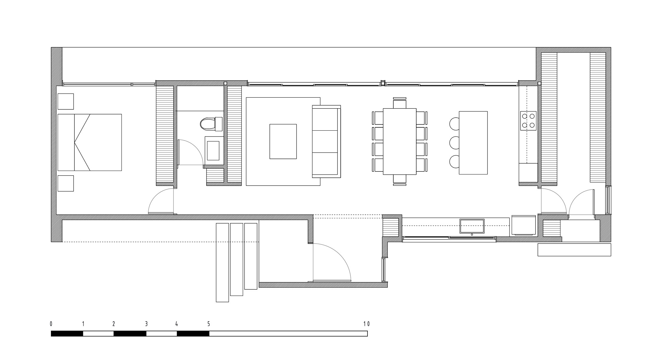 El proyecto se emplaza en Curicó, Región del Maule, sobre un terreno con pendiente creciente y orientación norponiente, abierto completamente hacia el valle central, lo que permite una vista amplia e ininterrumpida del paisaje. Esta condición territorial define la arquitectura del volumen, que se implanta en un solo nivel, apoyándose directamente sobre el terreno y rotándose 45 grados desde el poniente hacia el norte, estrategia que busca proteger los recintos del asoleamiento directo de la tarde y optimizar el control térmico. La propuesta nace originalmente como un quincho para la Casa NR, concebido como una primera etapa previa a la vivienda definitiva, pero evoluciona incorporando un dormitorio, baño, bodega y cierres perimetrales, permitiendo su uso como una casa habitable desde el inicio. Formalmente, se plantea un volumen lineal, limpio y ordenado, que no busca mimetizarse con el entorno, sino presentarse como una pieza pétrea, pesada y claramente definida, posada sobre el paisaje y enmarcada por una losa, alero y muros perimetrales de proporciones controladas que refuerzan la lectura horizontal del conjunto.